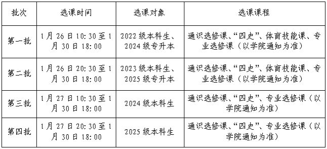 2025-2026学年第二学期选课工作将于2025年1月26日启动。为保障学生顺利完成网上选课,确保后续教学工作正常开展,各学院须高度重视此项工作,由主管教学副院长牵头负责本学院学生的选课组织与协调事宜。请各学院在接到本通知后,及时传达至相关学生,督促其在规定时间内完成选课。现将本次选课具体安排通知如下: